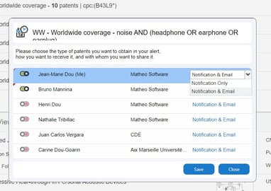 Create alerts on your queries, and automatically receive notifications and/or emails when new patents match your search strategy.