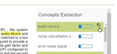 Patent Pulse generates a text analysis of the content of the claims, and presents the list of the main concepts (keywords or group of keywords) found inside the claims.