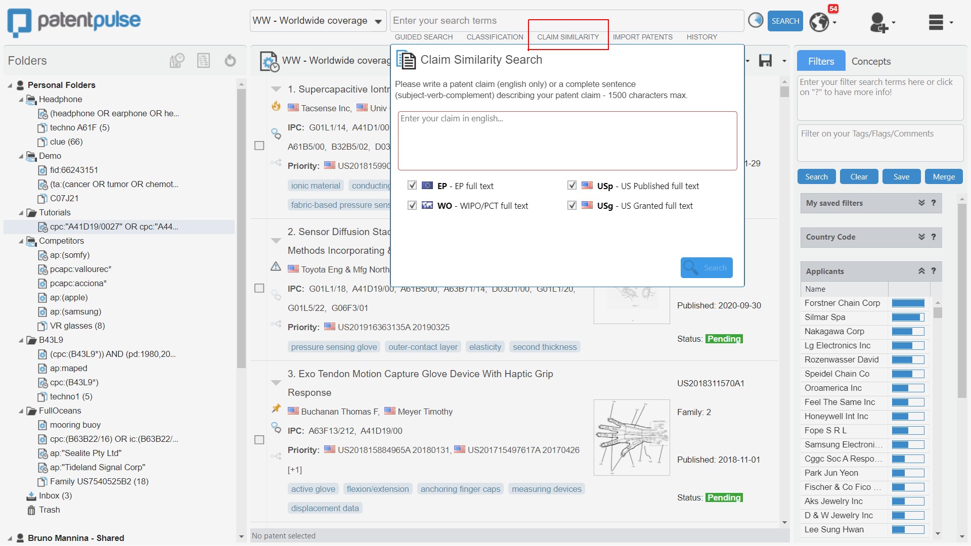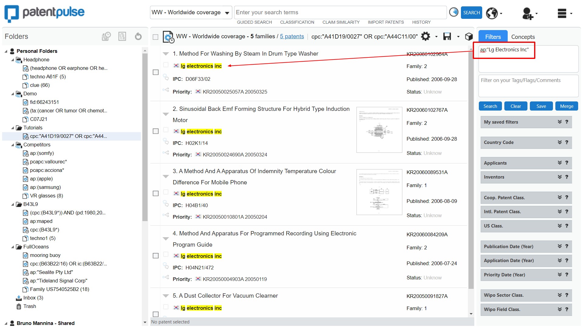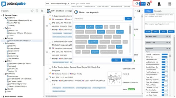 Users can filter their search results with new keywords, applicants, dates, IPC...