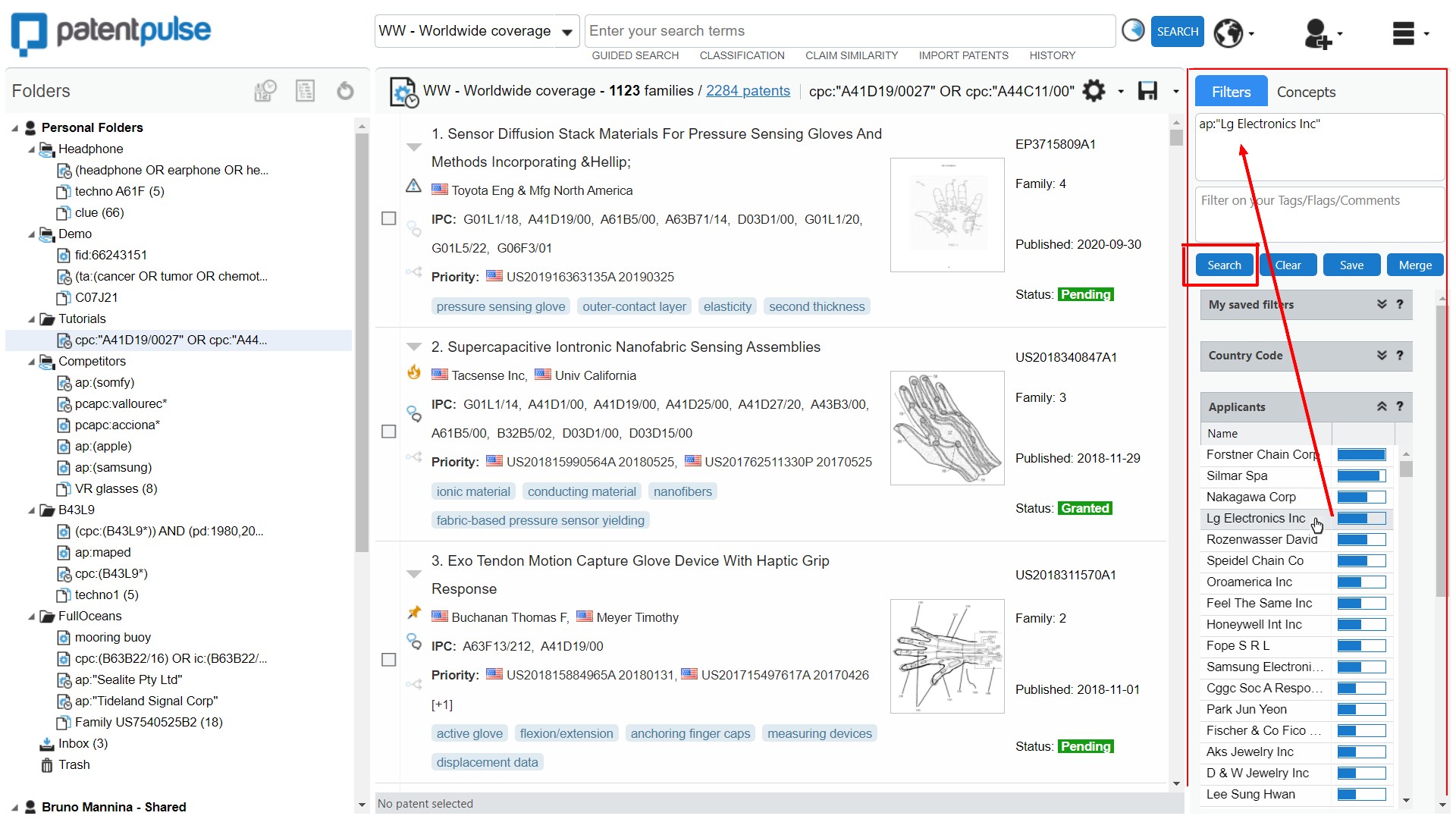Moreover, filters can be saved in your Patent Pulse account using Save button. And re-used with the My saved filters menu.