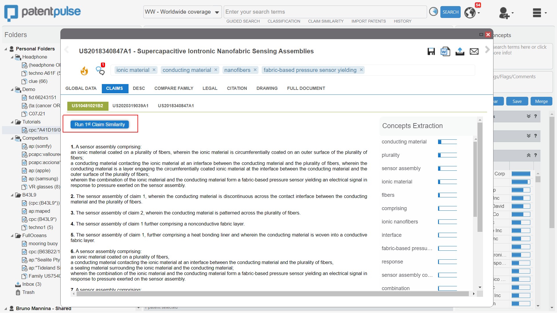 Concepts are automatically generated by Patent Pulse and based on the text analysis (text mining) of the Abstract and Title of the selected query.