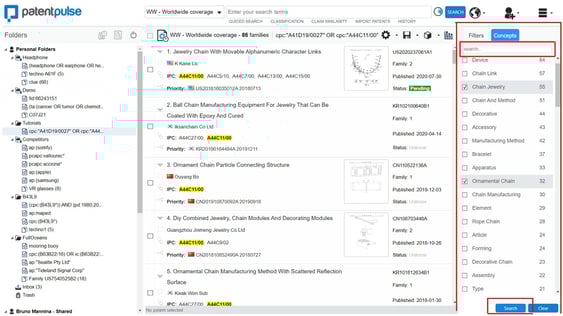 Select the concepts you want to explore, and click the Search button (bottom of the concept list) to access to the patents.